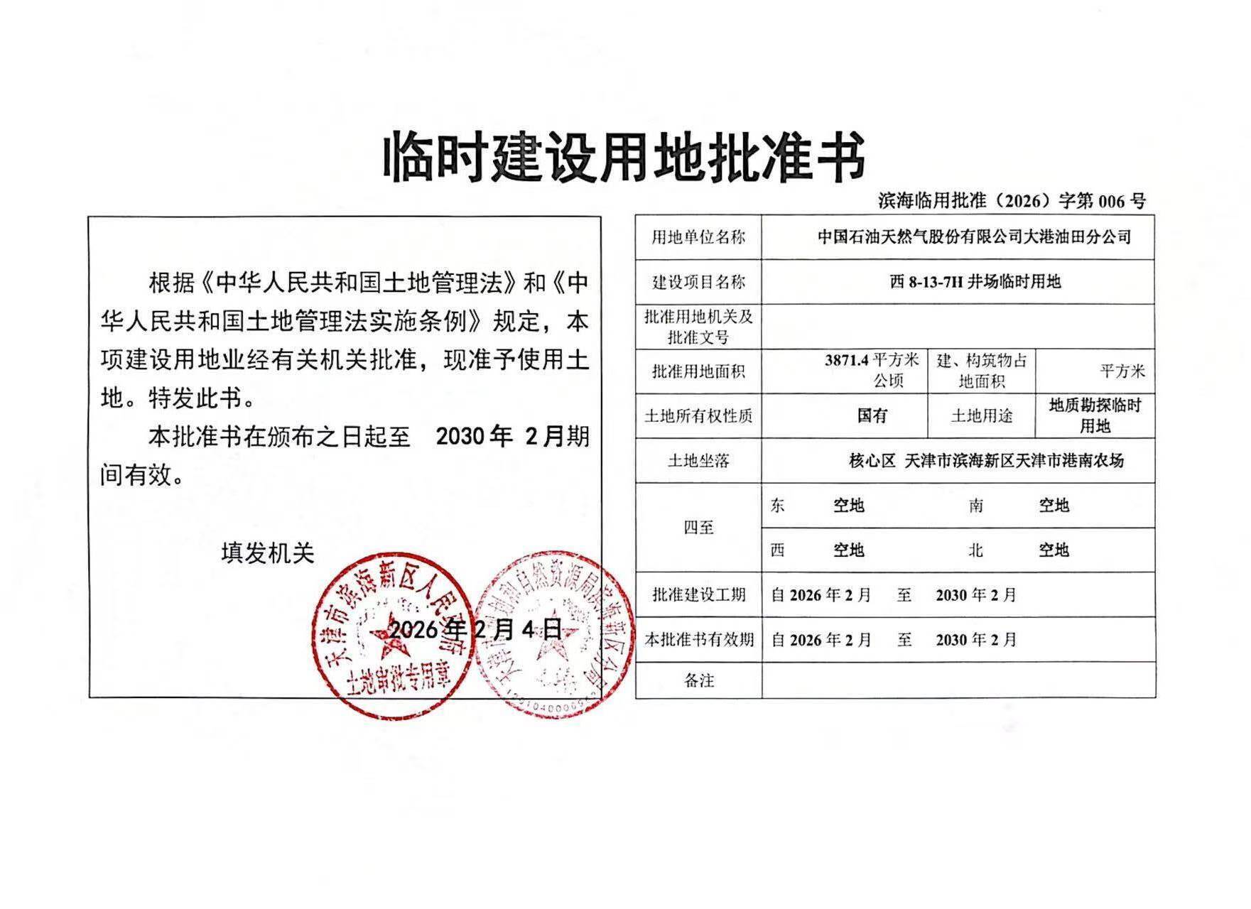 依据《自然资源部关于规范临时用地管理的通知》及《天津市临时用地管理办法》的有关要求,现将大港油田西8-13-7H井场临时建设用地批准书进行公告。