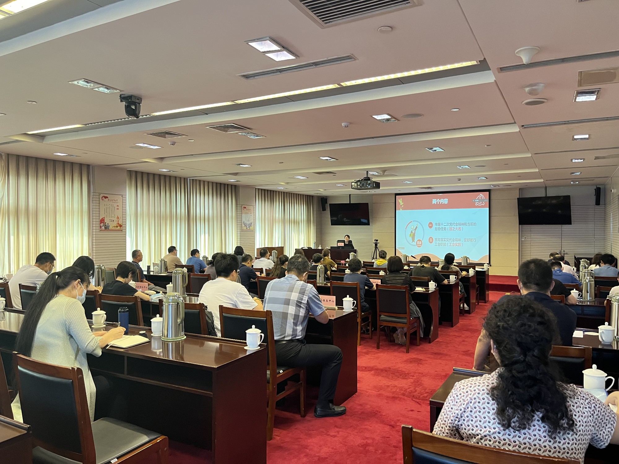 按照2022年度局工会集中培训计划,7月29日,k1体育(中国)官方网站 工会组织工会干部、“三委会”委员以及工会财务人员参加《学习贯彻市第十二次党代会精神,做好新时代的工会工作》专题培训。结合我局“迎盛会、铸忠诚、强担当、创业绩”主题学习宣传教育实践活动,引导全局工会干部坚定捍卫“两个确立”,坚决做到“两个维护”,积极践行劳模精神、劳动精神、工匠精神,当好职工群众信赖依靠的“娘家人”,切实承担团结引领广大职工听党话跟党走的政治责任,在奋力开创全面建设社会主义现代化大都市新局面上充分发挥工会组织作用。