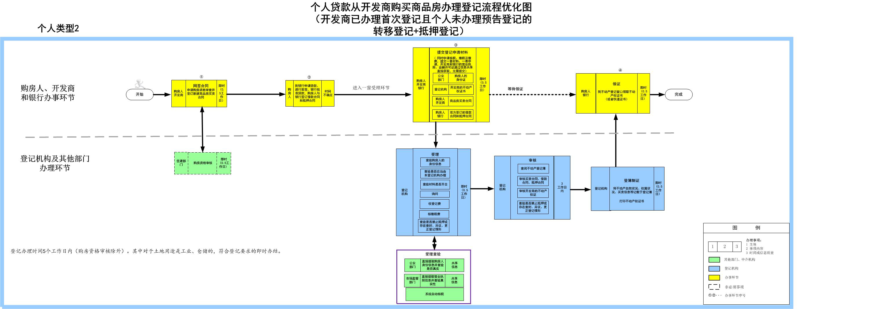 个人贷款从开发商购买商品房办理登记流程优化图(开发商已办理首次登记且个人未办理预告登记的转移登记+抵押登记)
