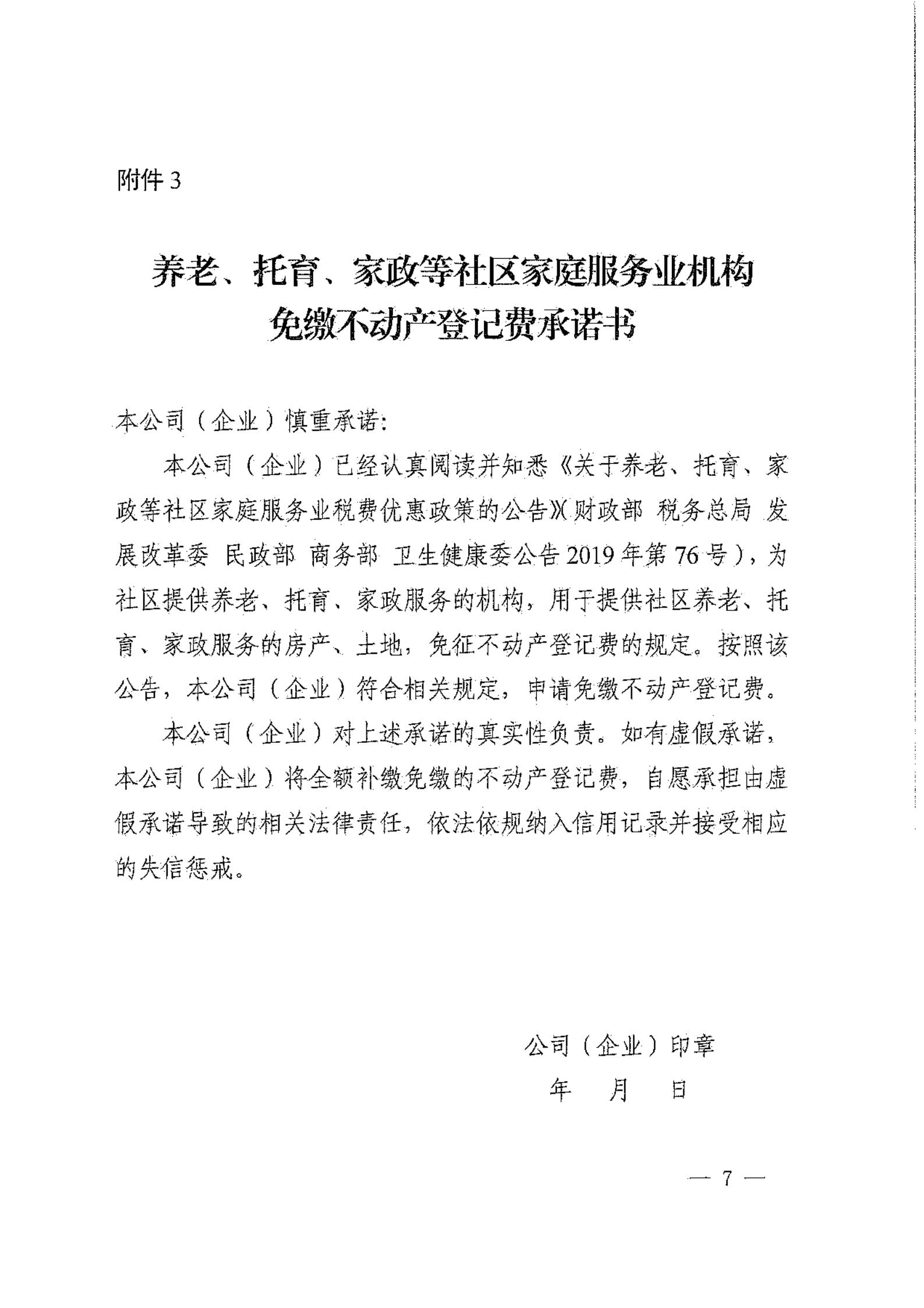 养老、托育、家政等社区家庭服务业机构免缴不动产登记费承诺书: