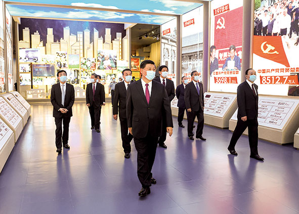 新近落成的中国共产党历史展览馆巍然矗立,气势恢宏。下午3时20分许,习近平等党和国家领导同志来到这里,步入展厅参观展览。展览以“不忘初心、牢记使命”为主题,精心设计了“建立中国共产党 夺取新民主主义革命伟大胜利”、“成立中华人民共和国 进行社会主义革命和建设”、“实行改革开放 开创和发展中国特色社会主义”、“推进中国特色社会主义进入新时代 全面建成小康社会 开启全面建设社会主义现代化国家新征程”4个部分,通过2600余幅图片、3500多件套文物实物,第一次全方位、全过程、全景式、史诗般展现中国共产党波澜壮阔的百年历程,浓墨重彩地反映党的不懈奋斗史、不怕牺牲史、理论探索史、为民造福史、自身建设史,使人们深刻认识到红色政权来之不易、新中国来之不易、中国特色社会主义来之不易,深刻认识到中国共产党为什么能、马克思主义为什么行、中国特色社会主义为什么好。