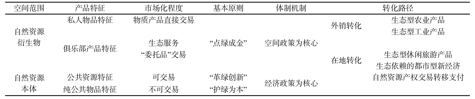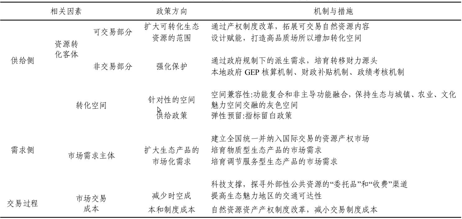 生态产品价值实现依赖于产权制度、市场机制、考核机制和空间政策的协同创新作为支撑,以协调统一自然资源客体(供给侧)、市场需求主体(需求侧)和交易成本(交易过程)等因素(表2)。