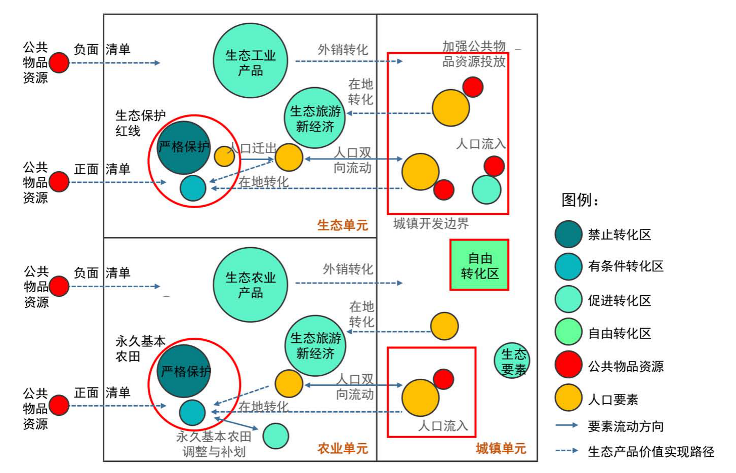 以“三区三线”管控为基础,根据资源本底条件和资产效应潜力分区,补充对要素流动性的差异化安排,包括要素流动范围、政策导向、管控目标和准入规则。通过对功能分区附着政策属性,促进不同功能分区之间要素高效有序流动,尤其注重流域和区域范围内发展单元间产权流转、城乡间要素双向流动。禁止转化区,应严格保护生态和耕地资源,推进生态移民,同时对准入用途设定正面清单。有条件转化区,主要是自然保护地一般控制区的镇村单元,在保护的基础上,允许科技要素的流入,探索具有明显外部性的环境质量权益的多种实现形式。促进转化区,主要是位于核心城市通勤距离范围内的镇村单元,鼓励服务于生态产品生产的公共物品投入,但应对准入用途、规模、强度、风貌设定负面清单,引导城乡人口双向流动,形成双城双栖的发展格局。自由转化区,主要是城镇功能区内的相关主导功能区或产业平台,应促进生态资源有效利用,鼓励人口流入,同时加强公共物品投放,提高建设用地利用效率(图3)。