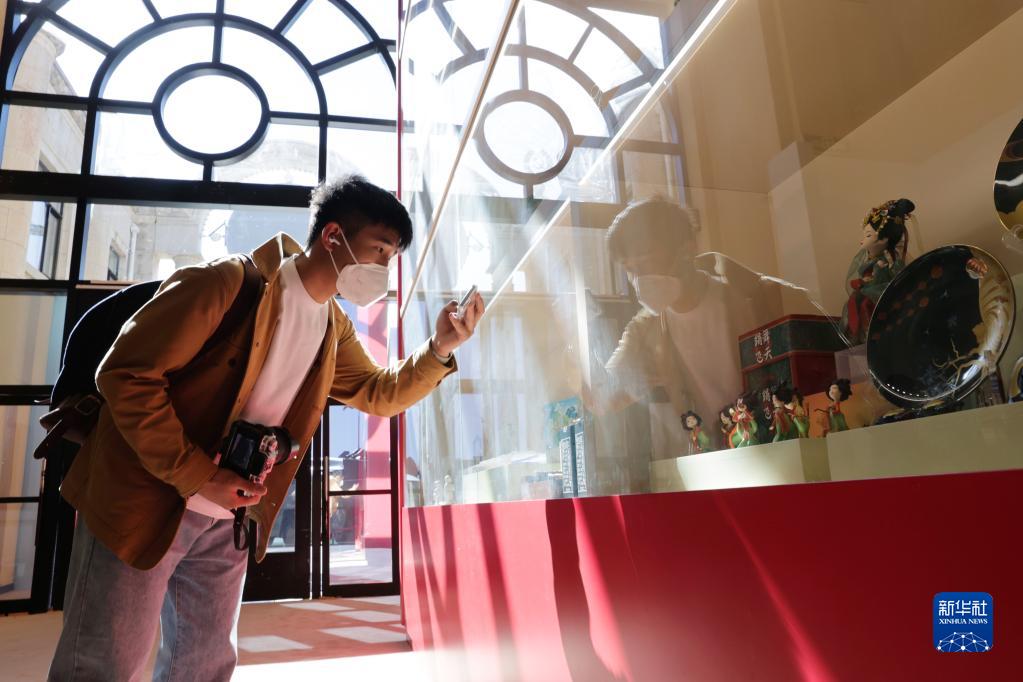 10月10日,观众在“奋进新时代”主题成就展第五单元“坚定文化自信 建设社会主义文化强国”展厅拍摄展示代表性非遗作品和文创精品的博古架。新华社记者 张玉薇 摄