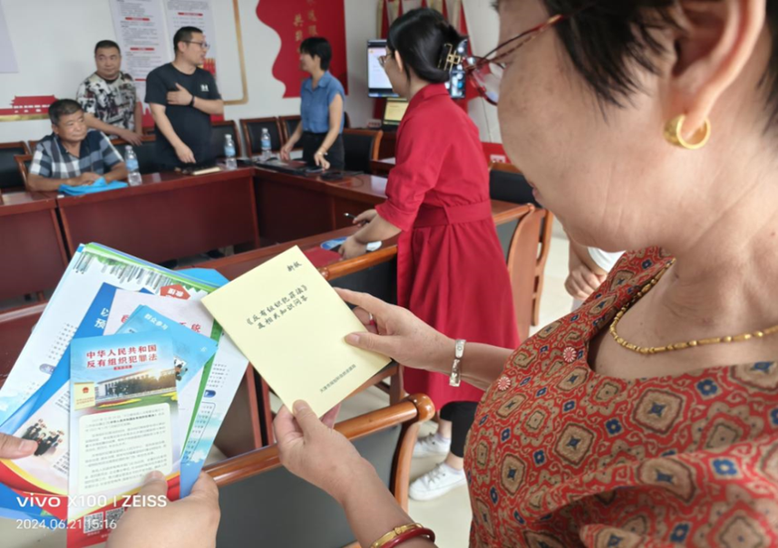 6月21日,津南分局在八里台镇西小站村、北闸口镇月桥村开展“送法进村”普法宣传活动。工作人员向村民赠送《<反有组织犯罪法>及相关知识问答》小册子,并邀请专业法律顾问向现场村民讲解法律条文、规章政策,提高了群众对《反有组织犯罪法》的认识,增强人民群众运用法律与黑恶势力作斗争的信心和能力,切实把宣传触角延伸至普法“最后一公里”。